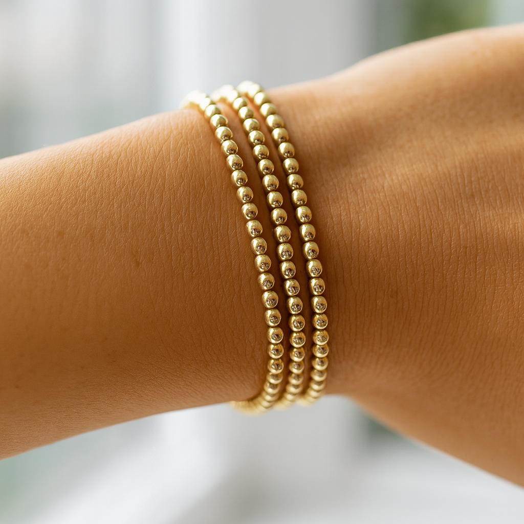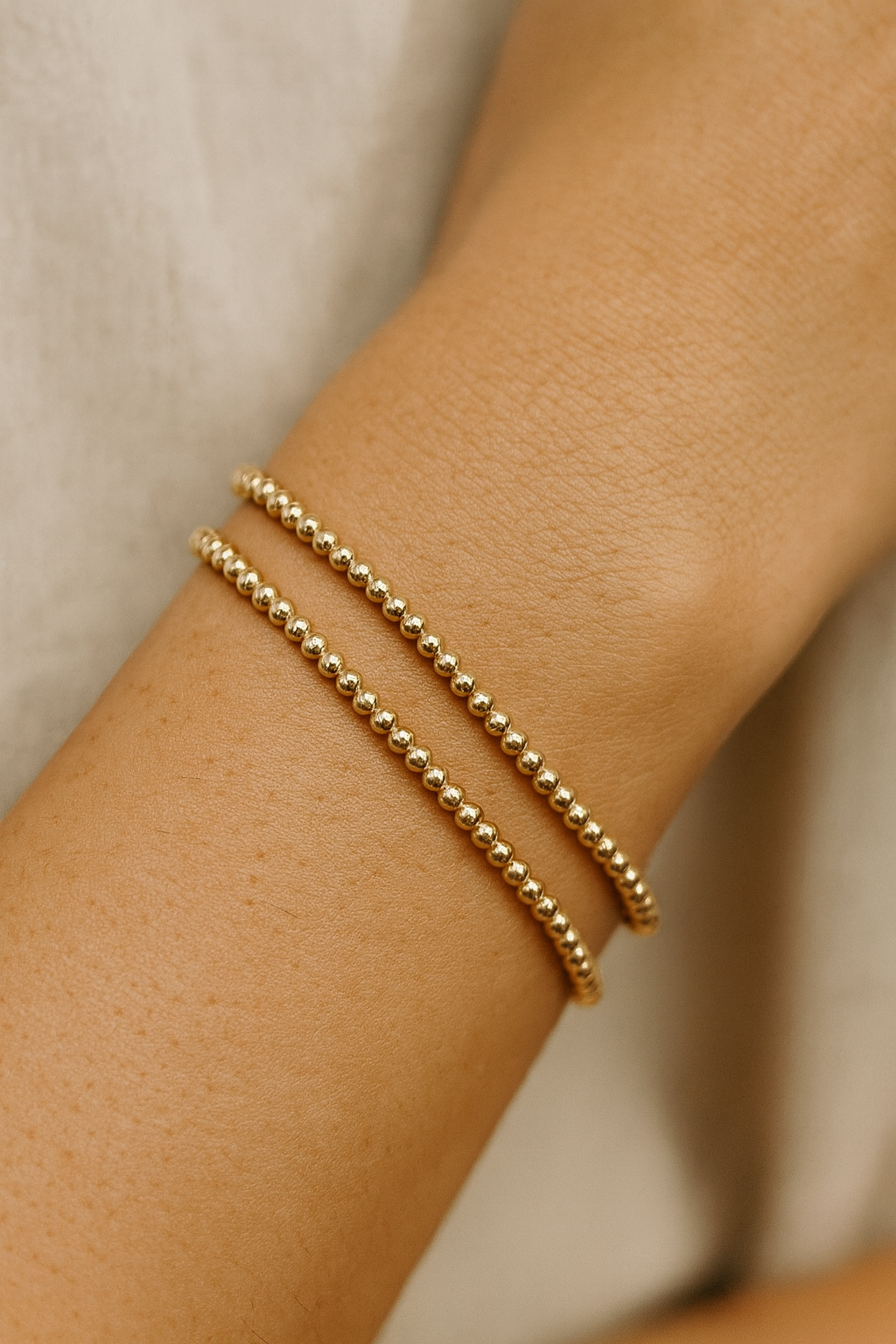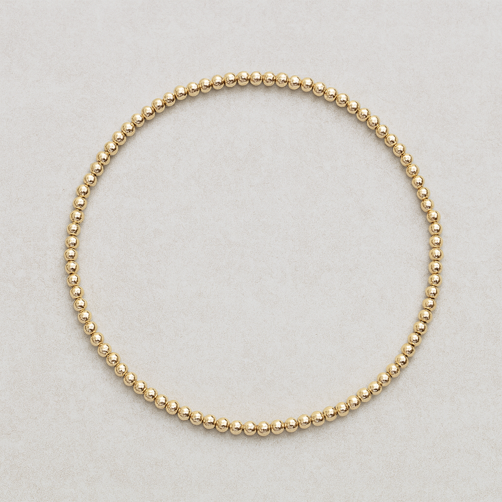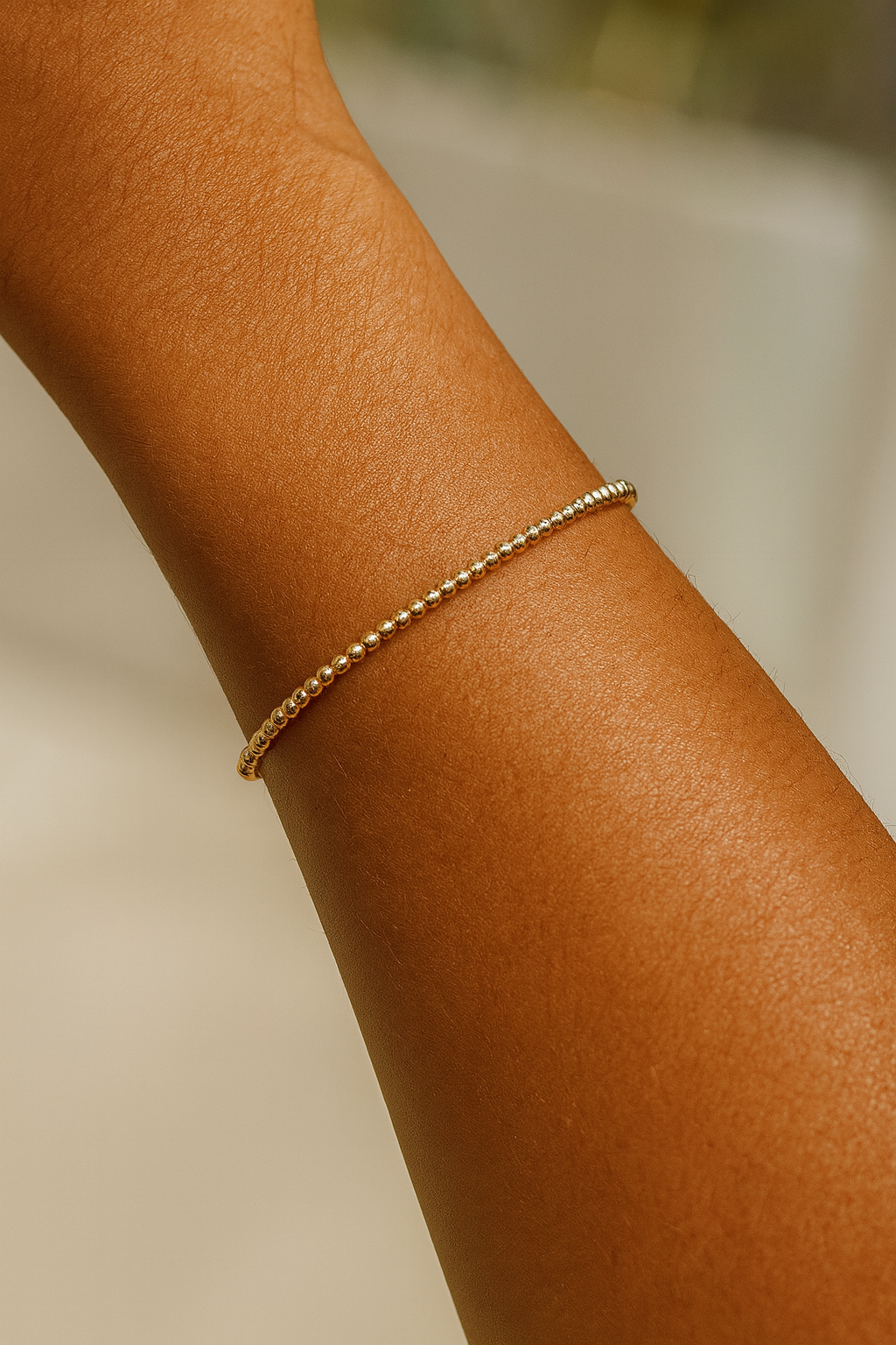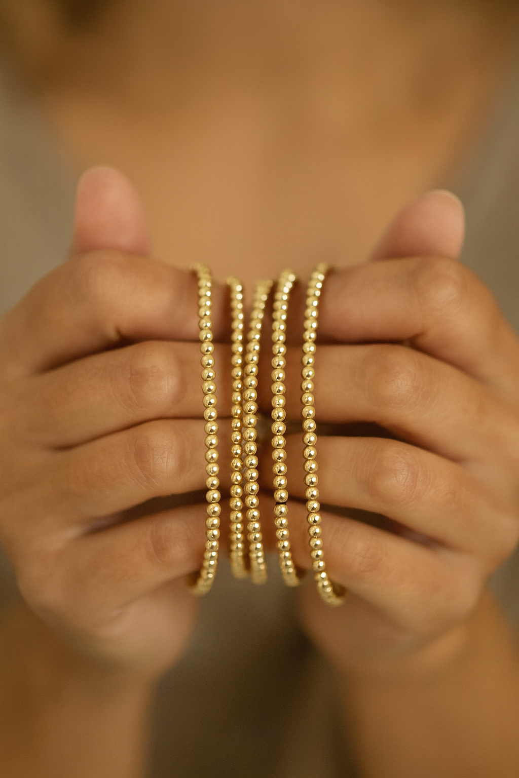 Timeless, delicate, and versatile, our Lucia bracelet features classic 14k Gold filled beads hand beaded onto a strong stretch elastic, for a slight stretch to easily roll on and off your wrist. Perfect to add to your daily stack of bracelets. Sleep, shower, sweat in it!